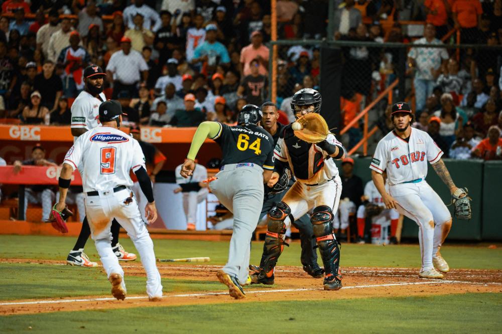El encuentro se mantuvo igualado 1-1 hasta la sexta entrada, cuando Leody Taveras se embasó por boleto, se robó la intermedia, avanzo asta tercera por rodado y anoto por wild-pitch del relevista naranja Yaramil Hiraldo, para tomar ventaja 2-1.