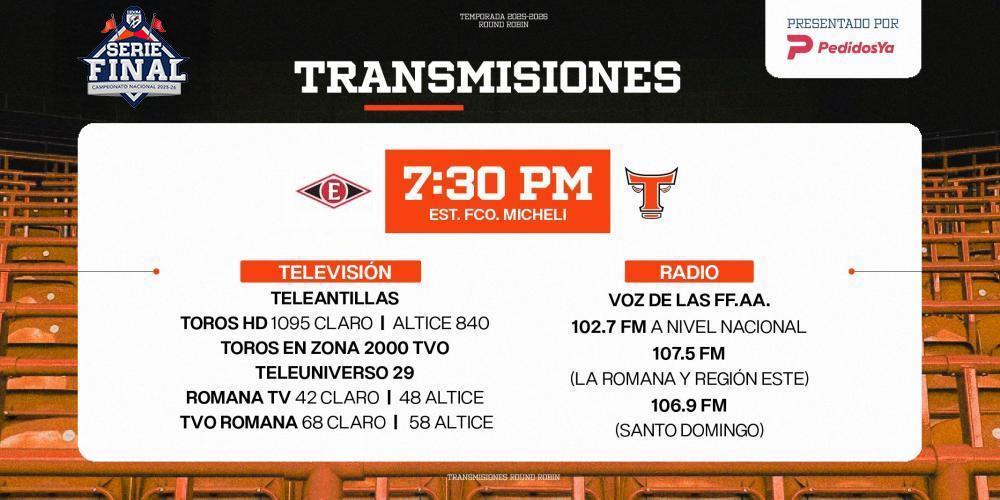 Los Toros del Este reciben esta tarde a los Leones del Escogido, en el Juego 4 de la Serie Final 2025-26, pautado para iniciar a las 5:00 pm en el Estadio Francisco Micheli.
